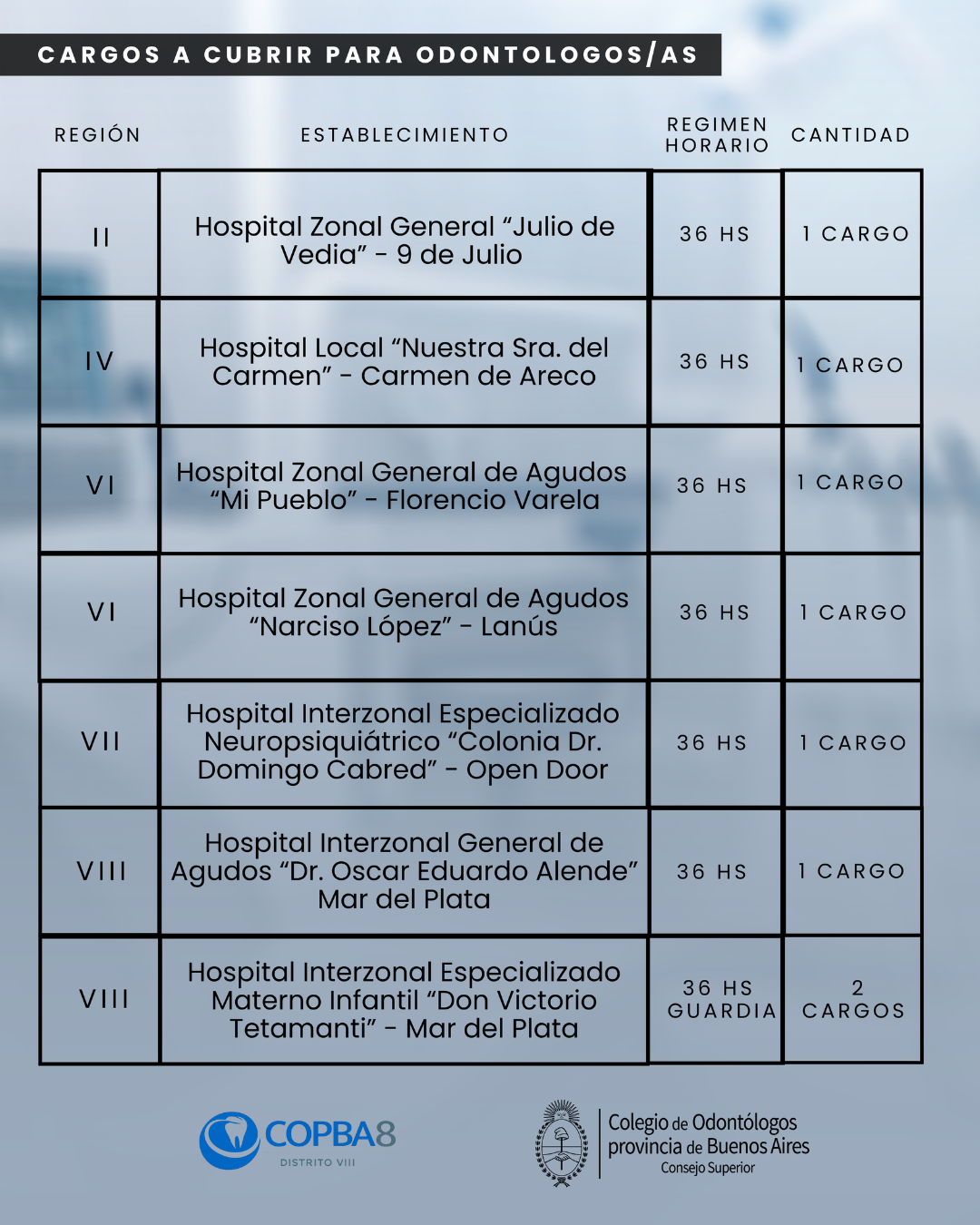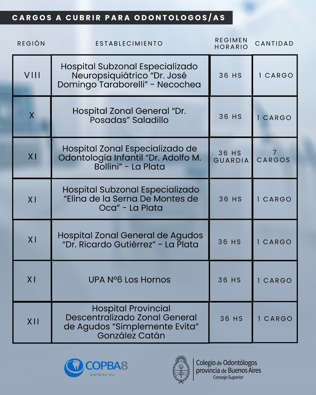 En esta convocatoria se incluyen 21 cargos destinados a profesionales de la odontología, distribuidos en distintas regiones sanitarias y establecimientos hospitalarios de la provincia: