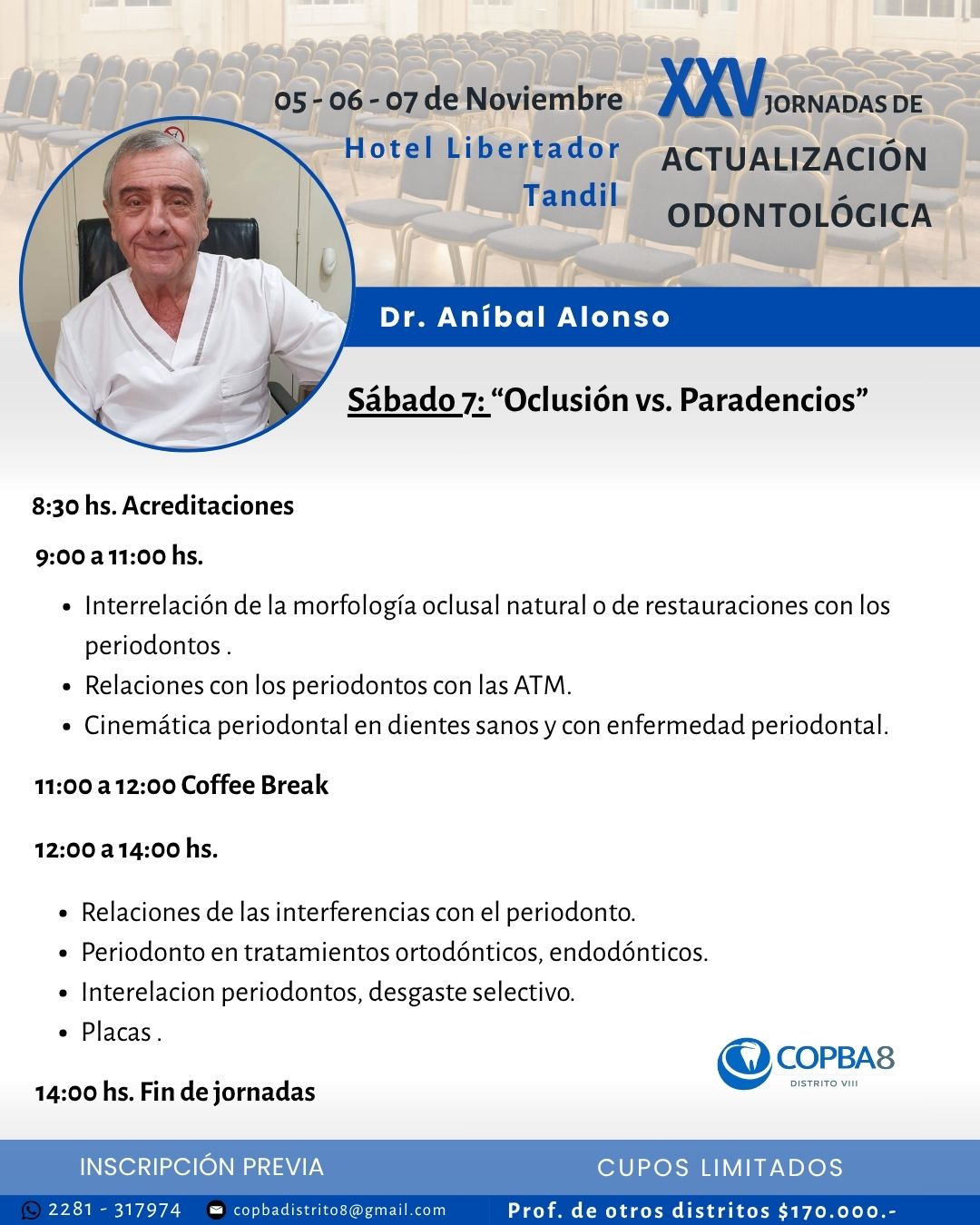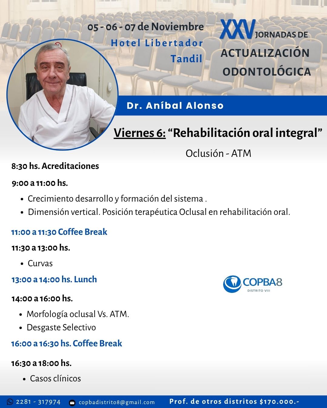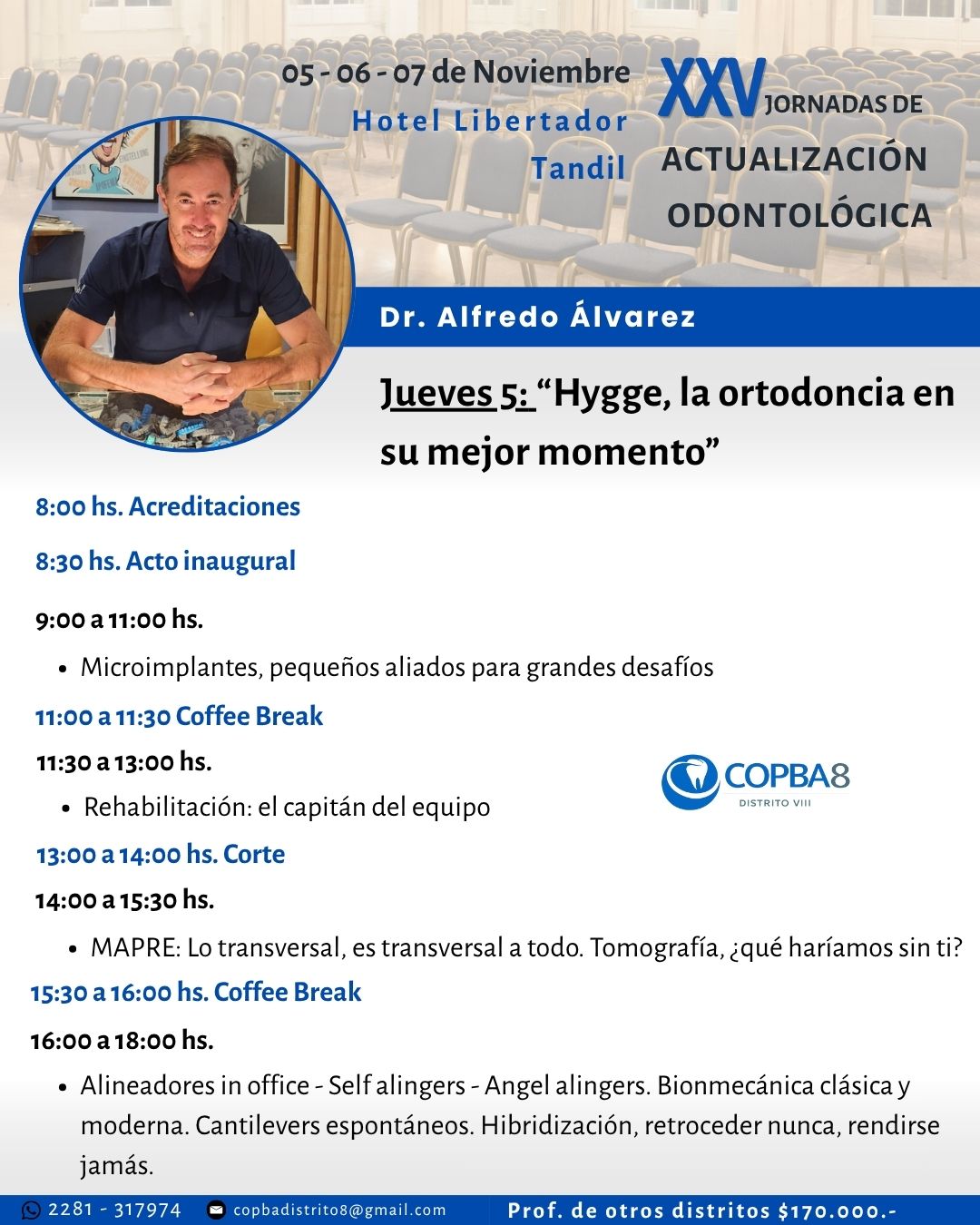 Te invitamos a vivir tres jornadas únicas junto a destacados disertantes como los Dres. Alfredo Álvarez, reconocido conferencista y docente de posgrado en ortodoncia, y Aníbal Alonso, Maestro de la Odontología Argentina y referente internacional en rehabilitación oral.